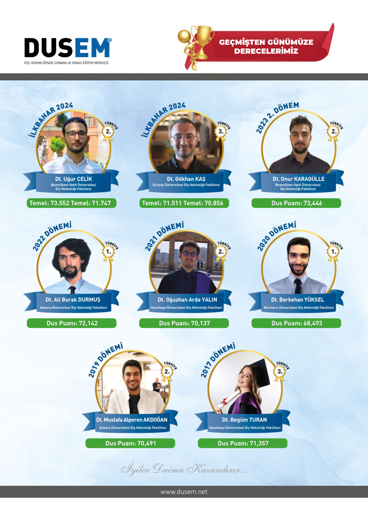 Türkiye'nin Paylaşımlı Uzmanlık Eğitimi Giriş Sınavı (DUS) Eğitim Merkezi olan DUSEM, başarılı 14 yıllık geçmişiyle uzmanlık eğitiminde lider kurumdur.